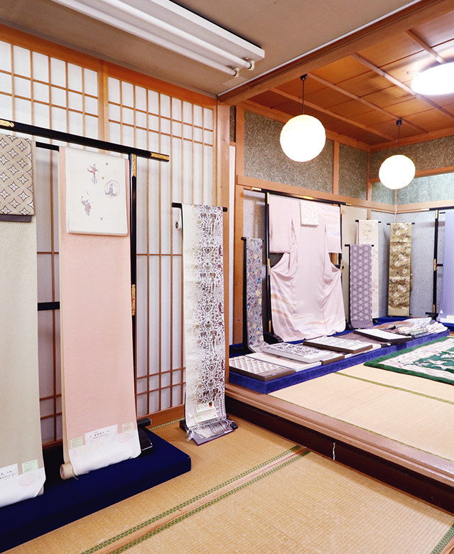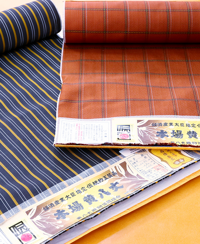 東京都指定無形文化財に指定された「黄八丈」をはじめとした高級な反物から、当店オリジナル白生地や浴衣、和装小物まで種類豊富にご用意しております。